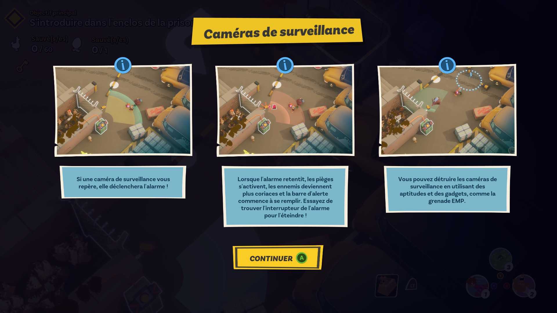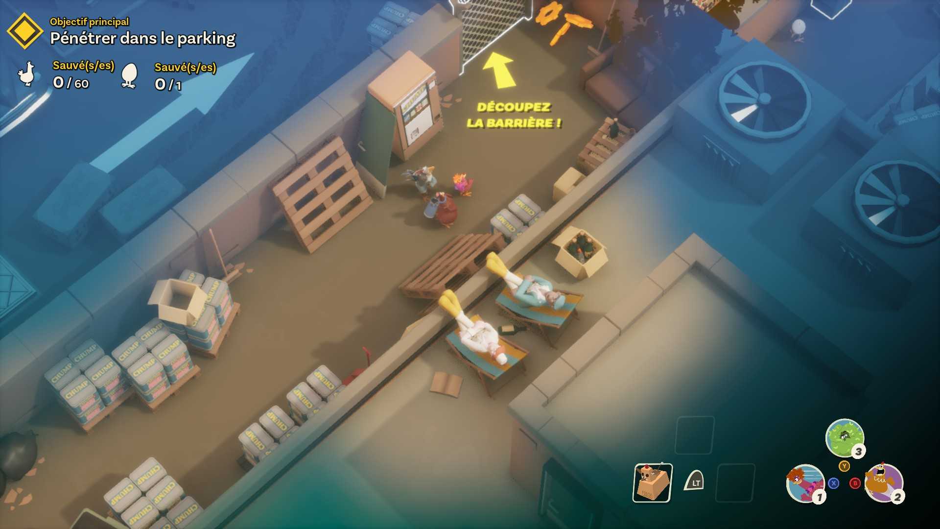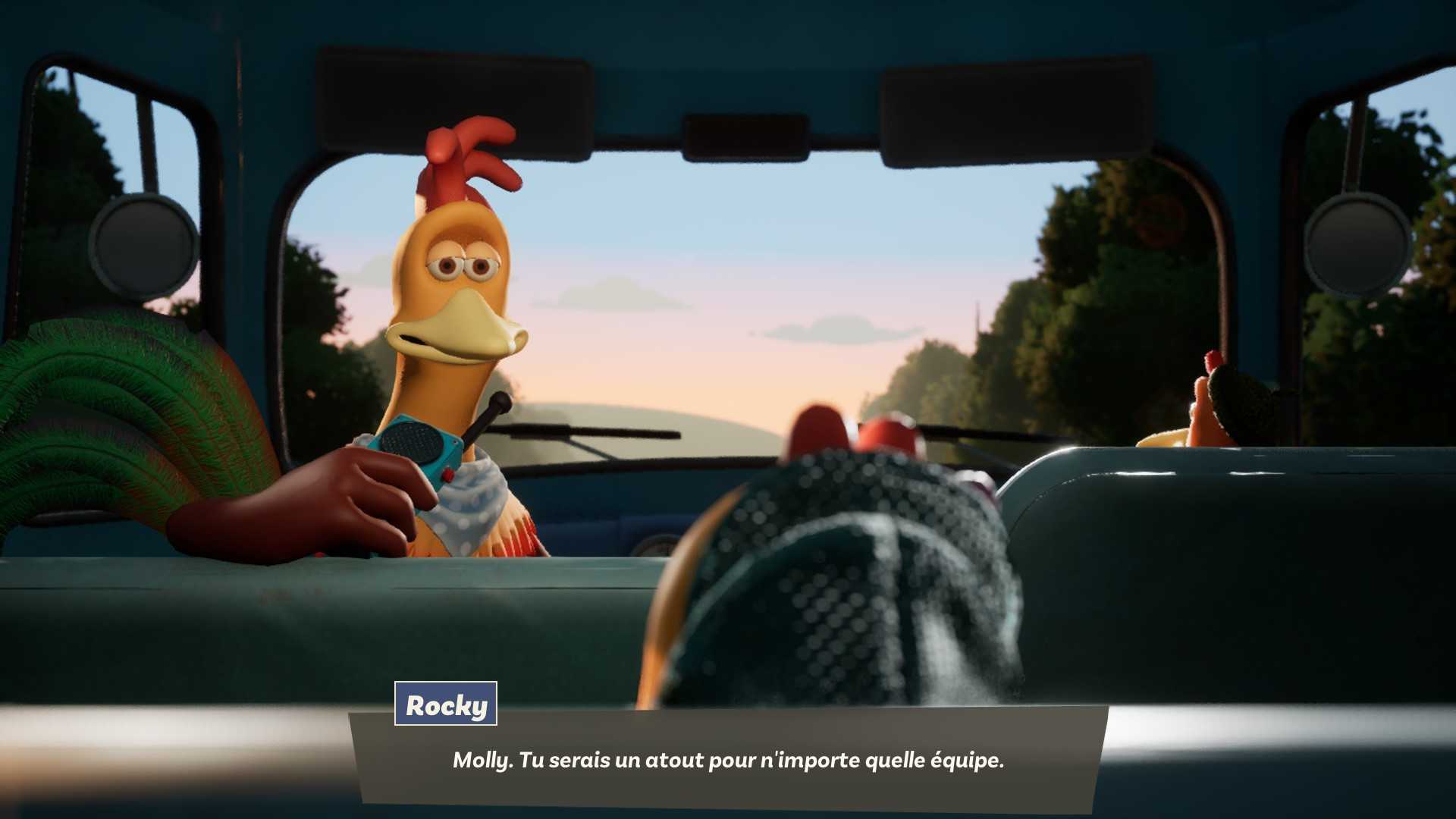 Le jeu propose deux styles : un mode guidé pour les novices, et une approche plus ouverte pour les experts du bonnet à plumes. Vous pouvez planquer vos pattes derrière des caméras de surveillance, vous déguiser en cône de signalisation, découper des grillages, actionner des conduits d'aération pour aspirer vos congénères et les expulser plus loin et ainsi éviter la ronde d'un garde, ou même carrément déclencher la panique en croisant les doigts pour que ça soit salvateur à votre basse-cour. Chacun de vos poulets héroïques dispose de capacités rigolotes, comme celle de Babette qui consiste à tricoter un leurre en forme de poulet pour distraire les ennemis. Tout cela se joue avec un esprit familial bienveillant : aucune complexité inutile, juste du fun partagé, en solo ou en coopération locale. Et les cinématiques ? Toujours aussi cocasses, dans la lignée du film.