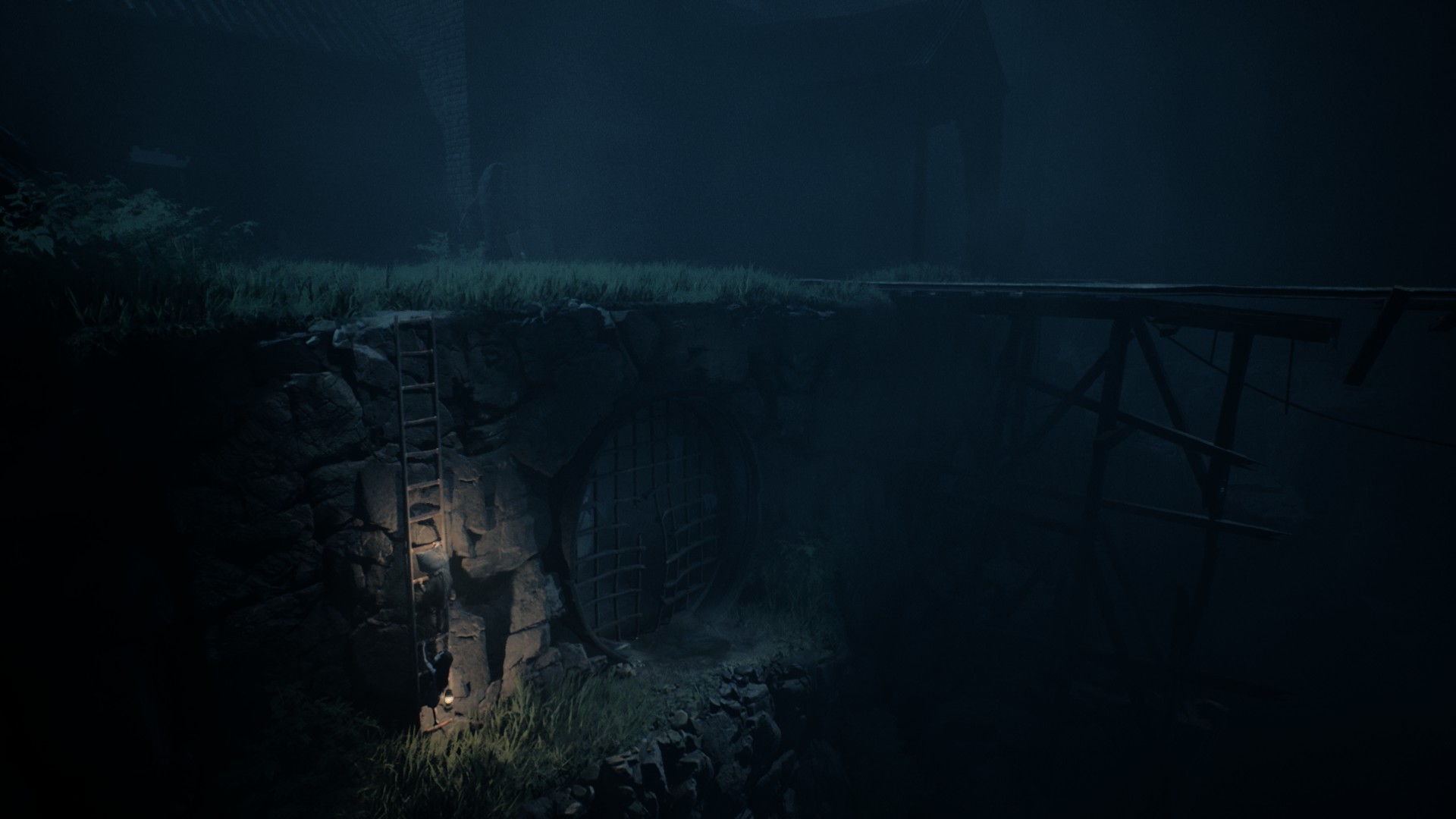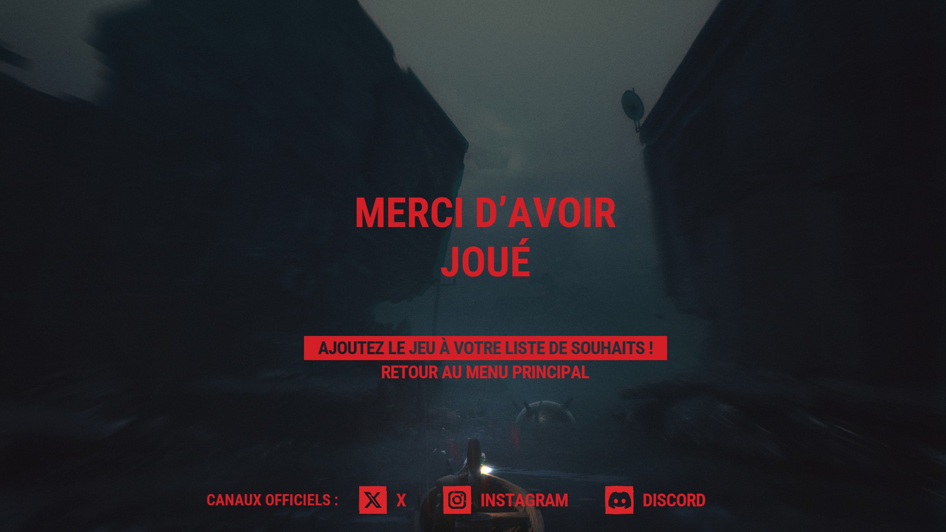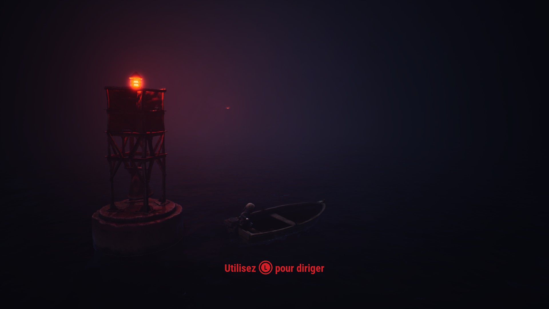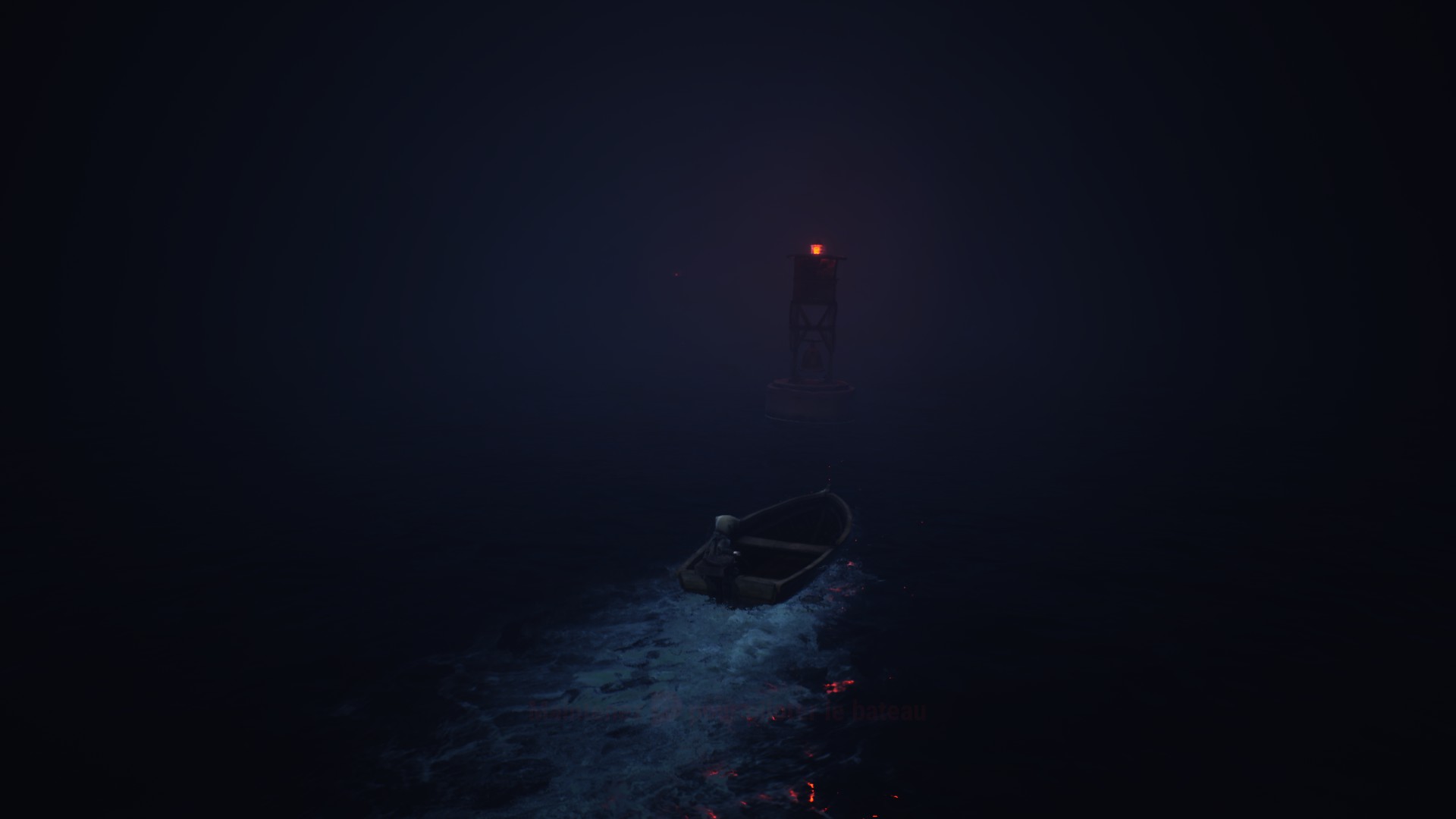 Le jeu s'ouvre sur une scène d'une efficacité redoutable : vous êtes à bord d'une barque à moteur, fonçant dans un noir quasi total, seulement guidé par quelques phares flottants aux lueurs rouges, comme un rythme cardiaque malade qui vous accompagnerait malgré vous. Cette entrée en matière installe immédiatement l'ambiance : pesante, sourde, presque hypnotique.
