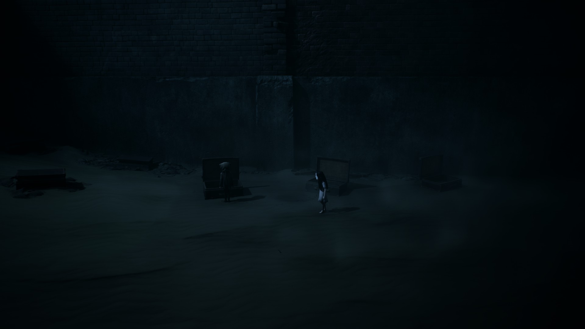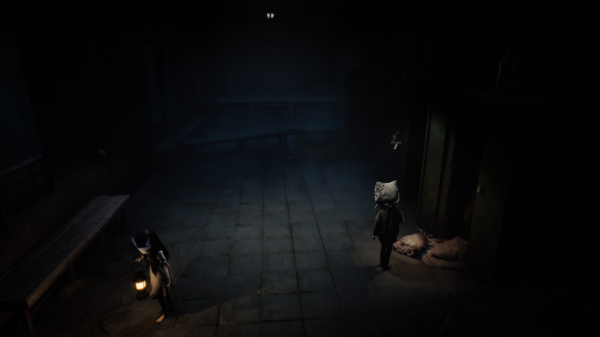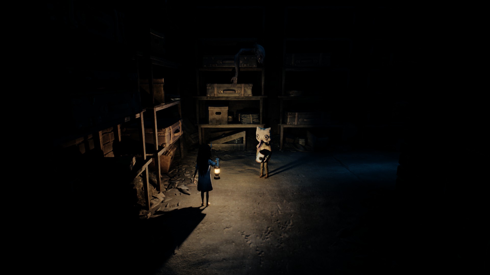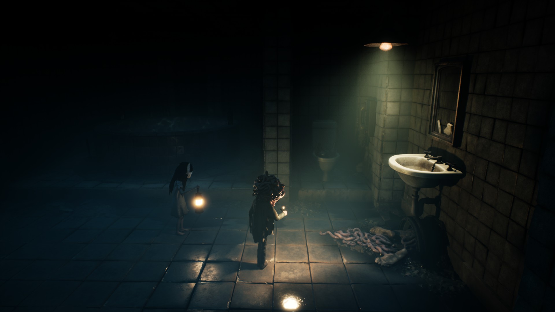 Très vite, on reconnaît la patte Tarsier : progression essentiellement latérale, environnements lugubres, silhouettes qui passent au loin, jumpscares parfaitement placés, et surtout coopération avec la fillette. Elle peut actionner des mécanismes, vous aider à atteindre des rebords trop hauts, ou encore créer des ouvertures indispensables à votre survie. Le duo fonctionne naturellement, comme un héritage assumé des mécaniques de Little Nightmares, mais avec cette dynamique à deux personnages qui modifie subtilement le rythme et les possibilités.