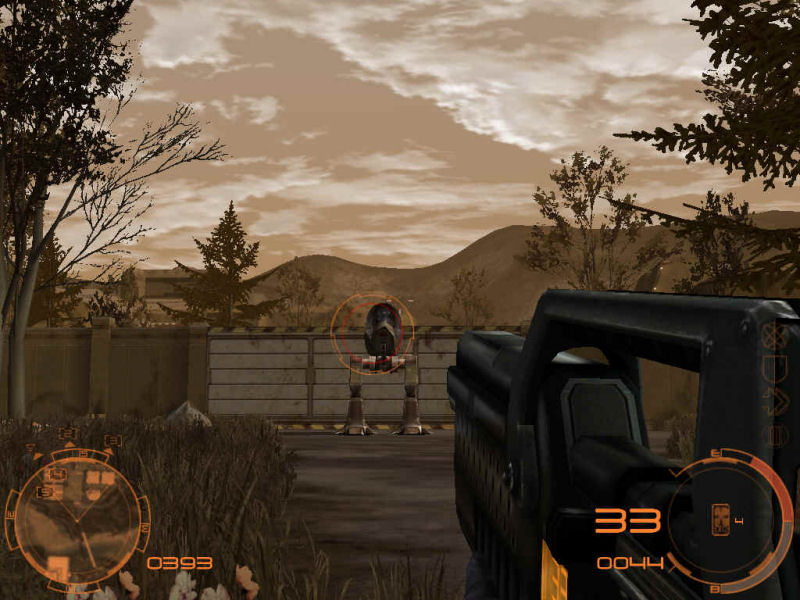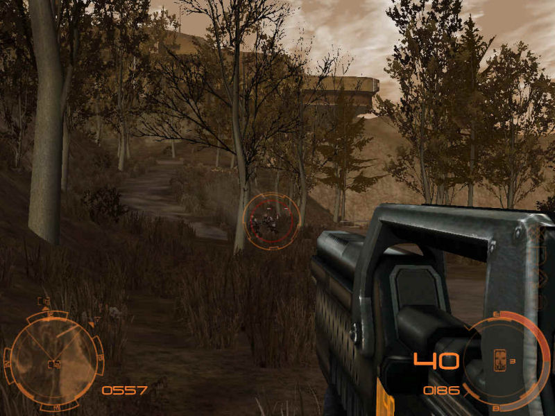 C'est une preview de FPS, il n'est donc pas vraiment nécessaire de passer des heures à présenter le contexte de l'action, qui se déroule en l'occurence quelque part au 22e siècle, et on incarne un membre d'un commando de la Fédération humaine, qui doit annihiler de méchants terroristes qui menacent l'équilibre du monde libre. Rien de nouveau sous le soleil de Vénus, donc. Et la première constatation que l'on fait en lançant une partie – après avoir pris conscience de l'interface entièrement orange – c'est que dans la jungle, on n'est pas tout seul. En effet, après avoir jeté un coup d'oeil à la jungle environnante, on se rend compte qu'on a des coéquipiers, qui en plus nous donnent des ordres, les bougres. Le bon côté, c'est que ça évite d'avoir à trop réfléchir sur ce qu'on va faire ensuite, et puis ça évite de se perdre dans le paysage qui a vraiment l'air immense – "l'air", parce que comme le chef nous commande d'avancer dès qu'on a tendance à trop s'attarder pour regarder le paysage, on n'essaye pas de sortir du sentier battu. D'autant moins que c'est une cause d'échec de mission. Et donc, droit sur les ennemis.