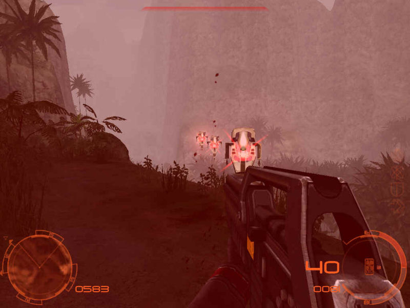 Les ennemis, ce sont principalement des soldats en armure du futur, à l'IA pas très intelligente, qui fait que malgré de véritables manoeuvres d'évitement – ils se mettent à couvert quand vous ouvrez le feu sur eux – leur recherche du couvert est plutôt limitée, et ensuite ils se contentent de se déplacer entre deux positions, vous laissant le champ libre pour vous placer de façon stratégique pour les allumer facilement à leur deuxième position, généralement à découvert. En avançant un peu, on a droit à de charmantes demoiselles au crâne rasé qui disposent d'un camouflage actif qui les rend plus ou moins invisibles, à la manière du Predator, et ça réhausse clairement l'intérêt, même si ça manque toujours un peu de recherche dans la façon de se placer. Tous vos ennemis sont équipés de grenades – on peut les leur voler une fois qu'ils sont morts – mais très peu daigneront vous en envoyer une sur la figure alors que vous êtes retranché derrière un obstacle, on a presque l'impression que les lancers de grenades sont scriptés lors de votre entrée dans un bâtiment. Reste une très bonne idée, celle de rendre la faune locale interactive, notamment des ruminants aux cornes menaçantes qui vous chargent si vous avez le malheur de leur tirer dessus, ou des sortes de vélociraptors qui vous foncent dessus en vous prenant, à raison, pour une bonne pièce de viande. Mais là encore, pas trop de recherche dans l'IA, ils vous foncent droit dessus, on est loin des explications du Docteur Alan Grant de Jurassik Park sur la stratégie des sauriens.