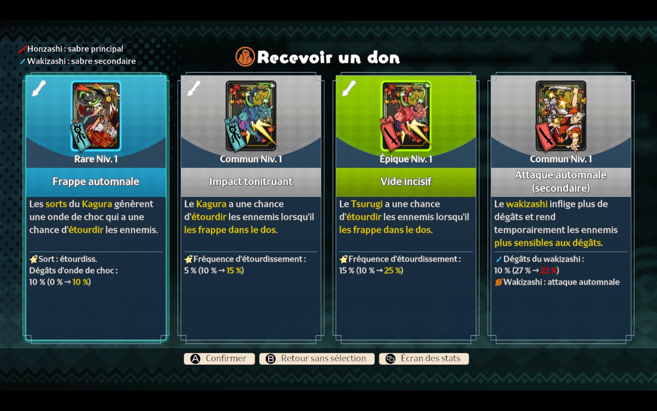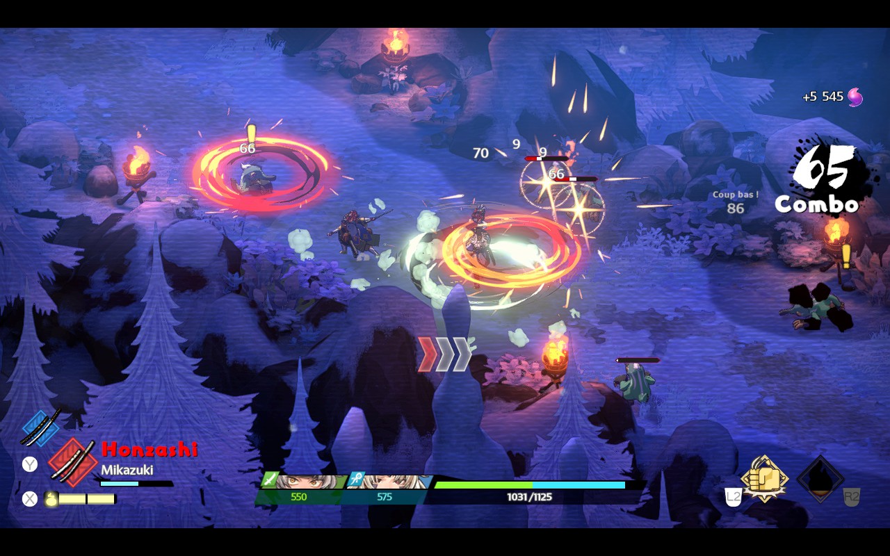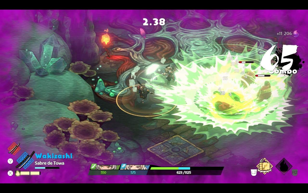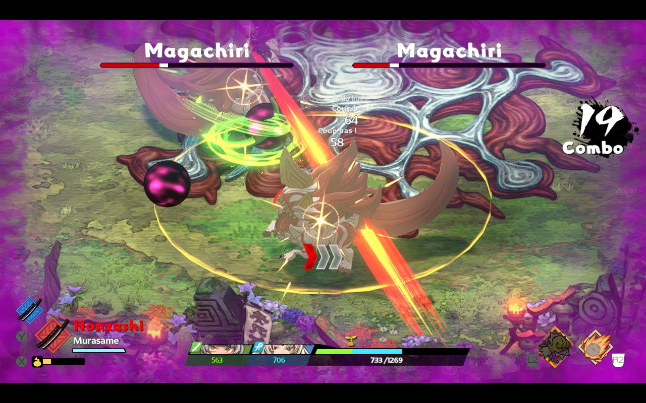 Le Tsurugi attaque les ennemis directement avec deux sortes d'attaques différentes liées à deux katanas différents. Plus vous attaquez, plus vous émoussez votre arme et quand elle se brise il faut changer d'arme et donc de type d'attaque. Mais quand vous changez à nouveau, votre arme de départ retrouve son aspect neuf. Le Kagura a un rôle de soutien, il lance des sorts d'attaque ou de défense selon le choix que vous faites. Il faut bien choisir ses sorts et bien accorder ses deux personnages pour obtenir une synergie parfaite et donc aller au bout du run. Cette idée est plutôt intéressante car vous ne spammez pas seulement vos attaques comme un neuneu, il faut aussi faire en sorte que vos deux personnages ne subissent pas de dégâts. Chaque personnage a sa barre de vie, si l'une tombe à zéro vous pouvez quand même continuer à utiliser les attaques ou les sorts du personnage en question.
