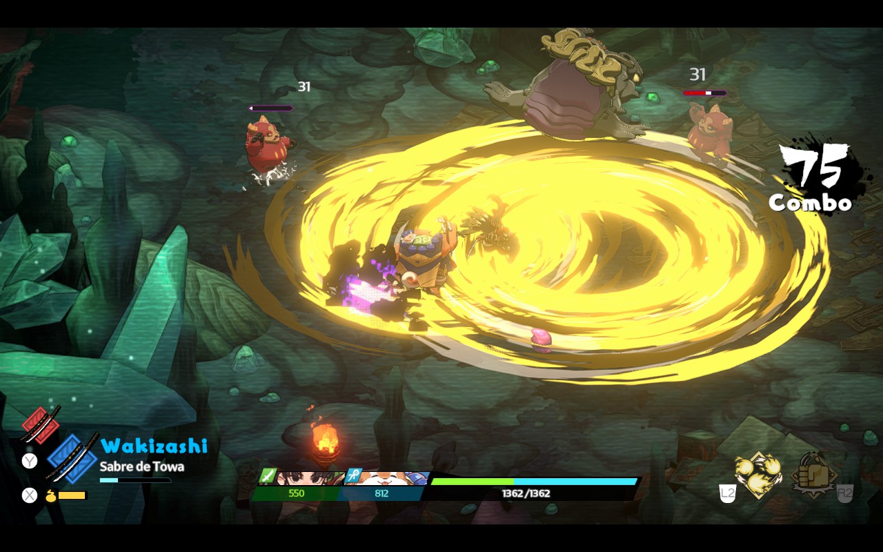 Contrôler les deux personnages est un peu compliqué au début et demande un peu de pratique. Le jeu semble assez lourd à la prise en main et peu instinctif. Il demande un certain investissement pour se sentir à l'aise dans la maniabilité des personnages et c'est l'un des défauts du jeu. Quand d'autres titres du genre vous font sentir une fluidité immédiate, Towa and the Guardians of the Sacred Tree vous semble lourd et la marge de progression est peu perceptible au tout début. Pourtant, ce devrait être l'inverse, une montée en puissance rapide douchée par votre arrivée à un certain palier du jeu. Cela est lié à ce choix de maniabilité qui s'avère audacieux et qui finit par payer si vous décidez de laisser sa chance au produit.