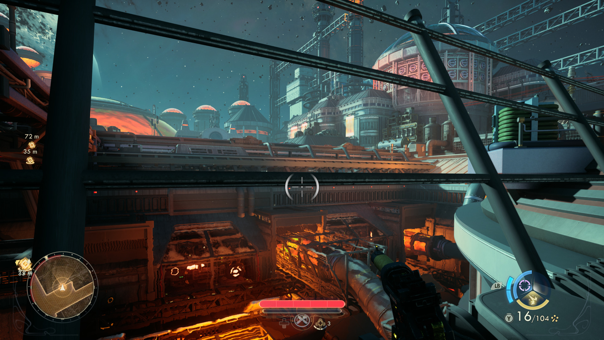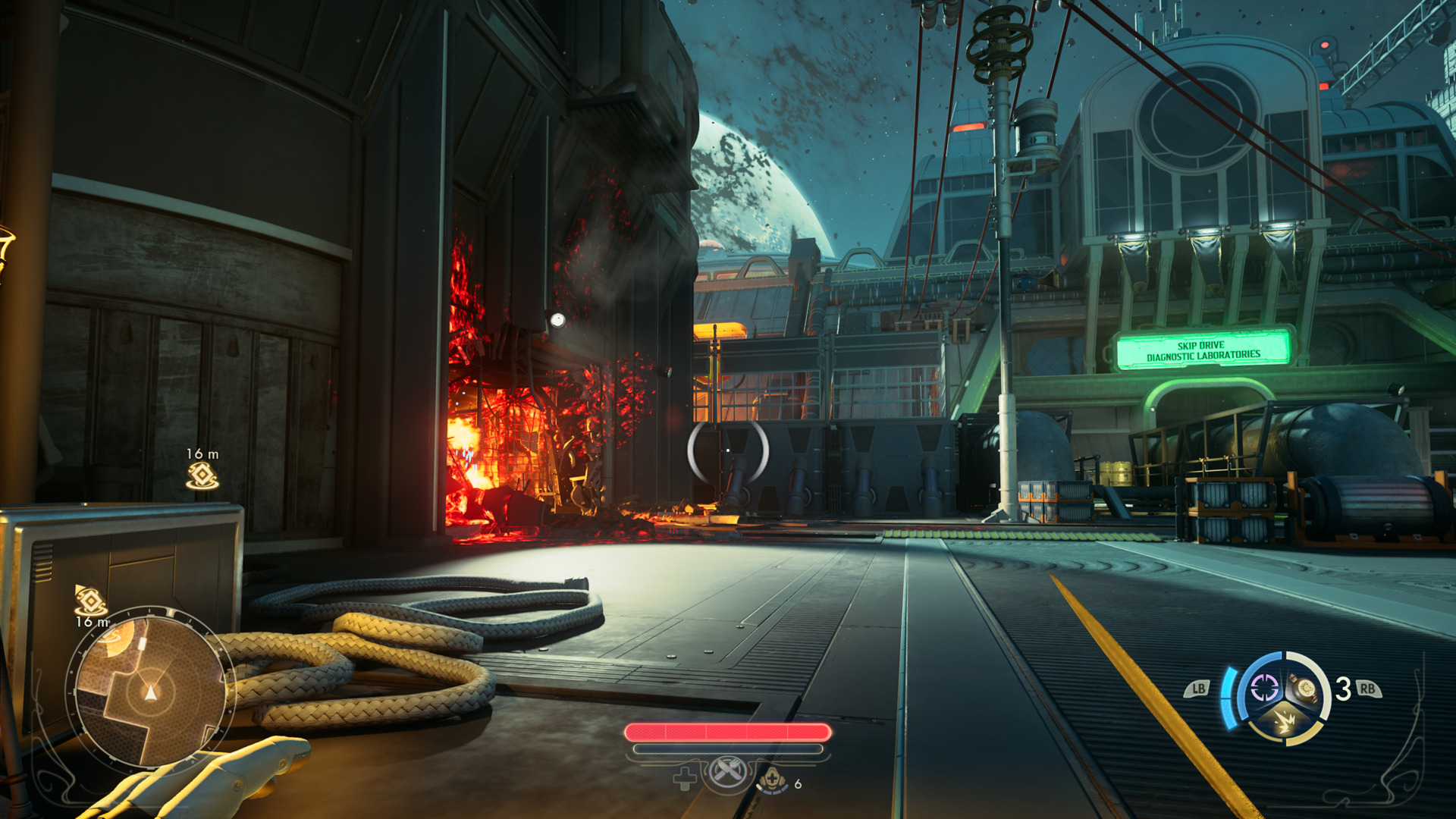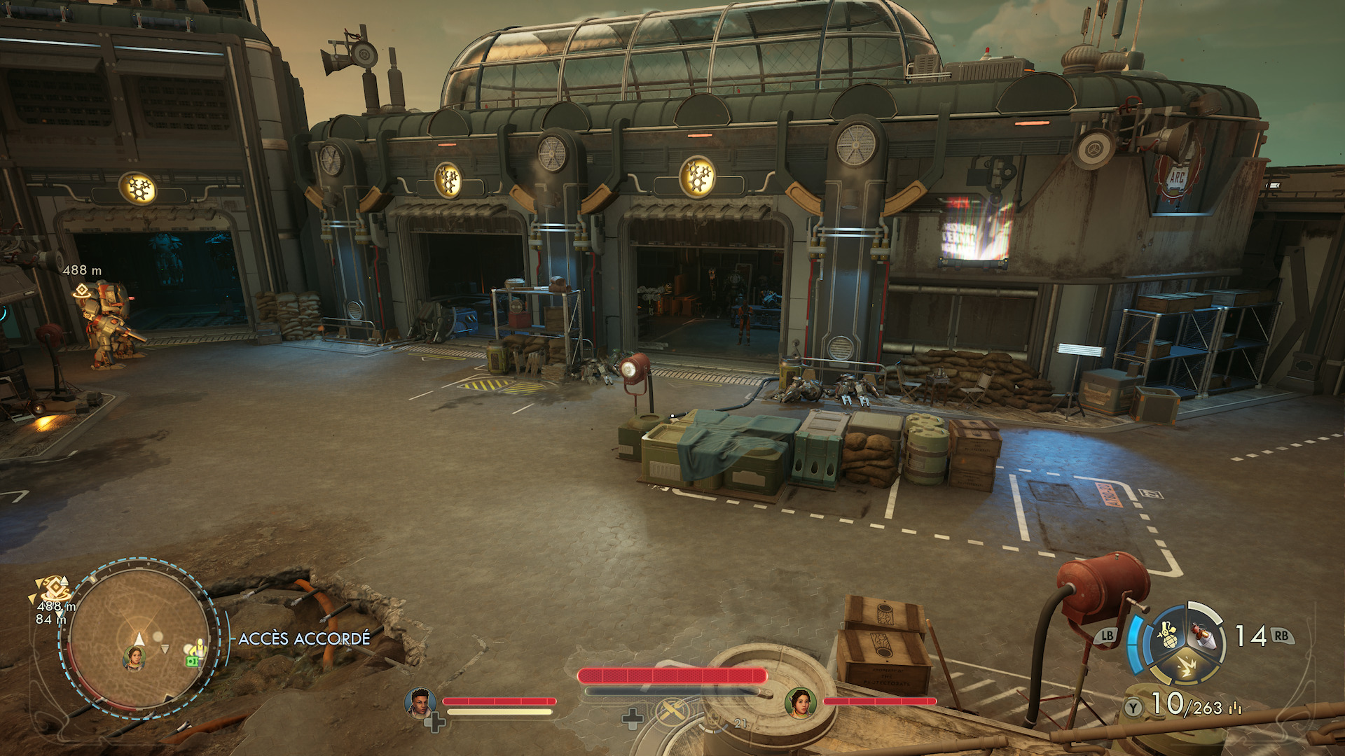 La série The Outer Worlds se base sur l'idée qu'une tâche peut être réalisée de trois façons : la force, la discrétion et le dialogue. Ce pilier central est amené avec assez de profondeur, car chaque angle propose très souvent différentes approches. Différents traits peuvent mener à différentes négociations avec succès, la discrétion peut passer par de multiples chemins, et l'action se voit attribuer de divers outils offensifs. The Outer Worlds 2 se veut complet dans ses approches, sans en être trop complexe. L'exploration des bâtiments apporte une verticalité qui diversifie l'approche qu'on peut avoir du terrain. Une porte verrouillée peut être crochetée, mais contourner et grimper peut permettre de découvrir d'autres passages. La fouille est récompensée, car découvrir diverses notes permet de débloquer des dialogues inédits à l'enquête. Par ailleurs, si la verticalité est mise à l'honneur à cette échelle, l'horizontalité est assez fastidieuse. L'environnement est labyrinthique, préférant la navigation par carte plutôt qu'au regard du décor. Obsidian montre que ce qui l'intéresse, ce sont les villes et l'échelle micro plutôt que macro. The Outer Worlds 2 s'illustre parfaitement dans son ensemble cohérent.