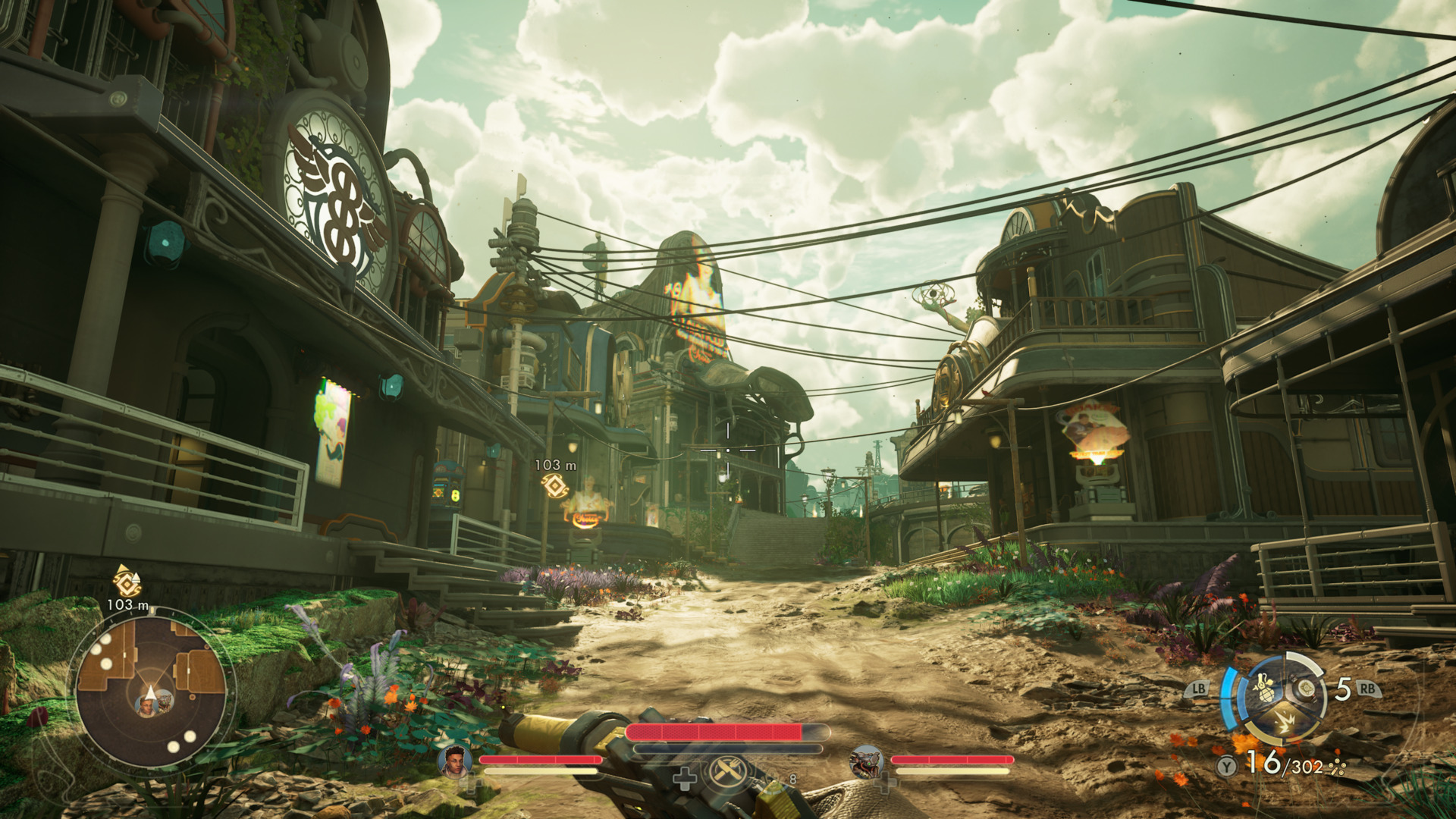 La direction artistique de The Outer Worlds, depuis son premier opus, épouse des associations de couleurs déroutantes pour transmettre l'exotisme des environnements aux tons plus bruts et gris des structures humaines. Les formes sont plus arrondies qu'anguleuses, puisant leur esthétique dans celle de l'atompunk et de l'art nouveau. Un contraste qui mêle sur-technologie et figurations naturelles. Si l'esthétique bien caractérisée fonctionne à merveille en pleine ville, les décors sauvages ressemblent plus à un fourre-tout hasardeux. La bande-son rêveuse, quant à elle, rend hommage à l'intensité de l'univers interstellaire, et le sound design très léché englobe vos oreilles avec justesse. Il n'est d'ailleurs pas sans rappeler, par certains moments, la bande-son de Fallout. Un autre point qui montre tout l'héritage de Tim Cain et son comparse.