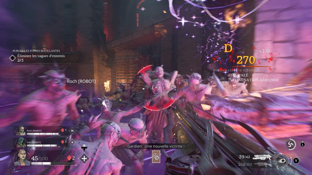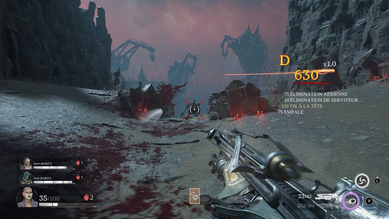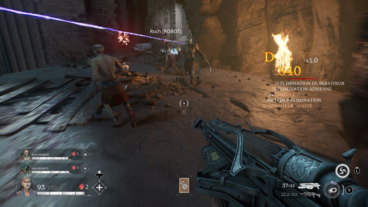 Imaginez un Doom qui enchaînerait les arènes de combat... en version coop. Vous alternez entre le fusil à pieux, le lance-glace ou la mitrailleuse démoniaque, tous dotés de doubles tirs aux effets délicieusement excessifs. Le plaisir vient donc du rythme : pas de temps mort, pas d'hésitation, juste une transe nerveuse, portée par une bande-son metal qui vous martèle la rétine autant que les tympans.