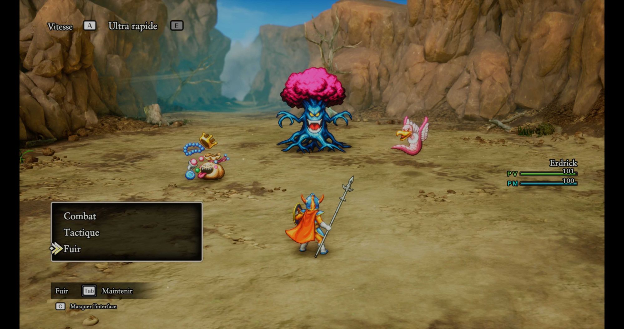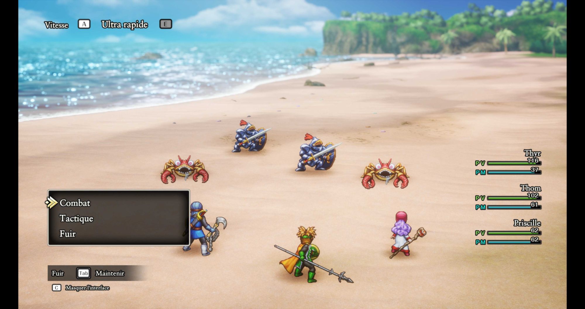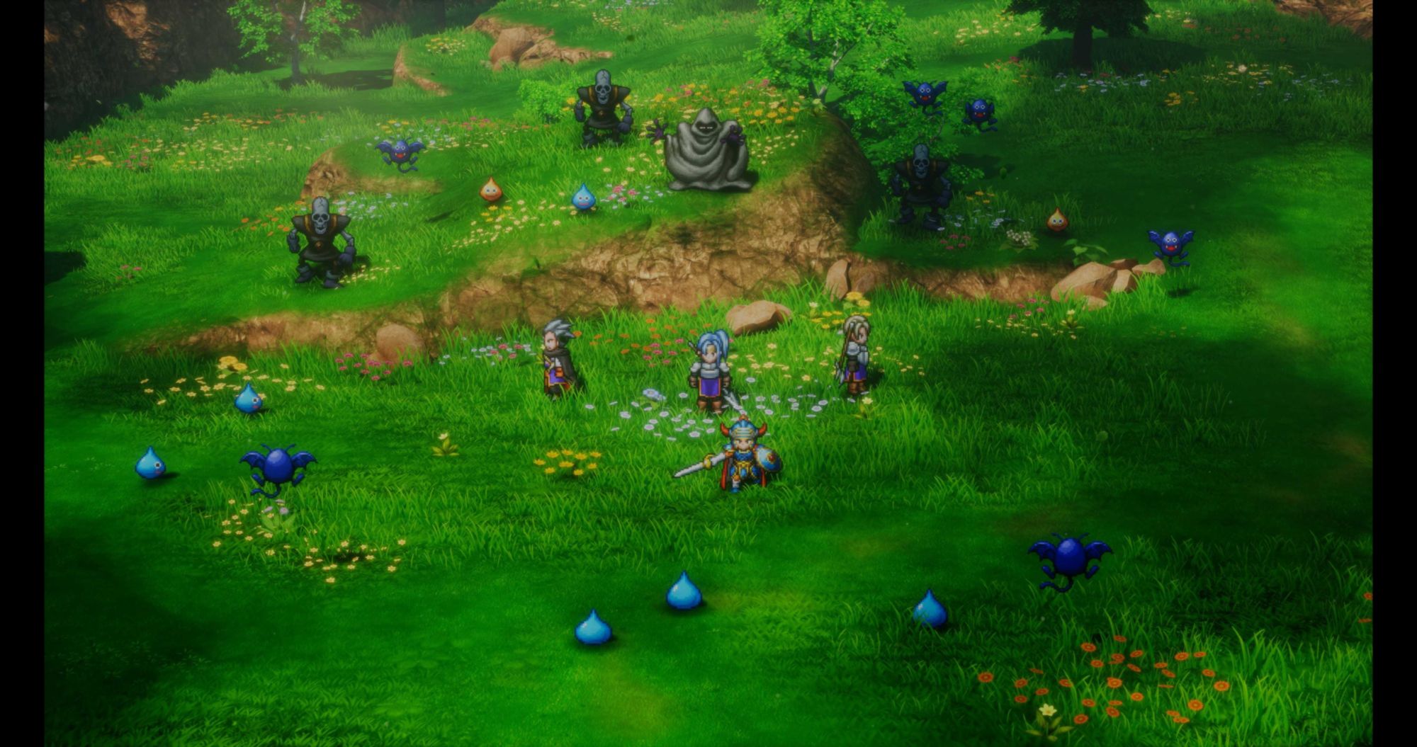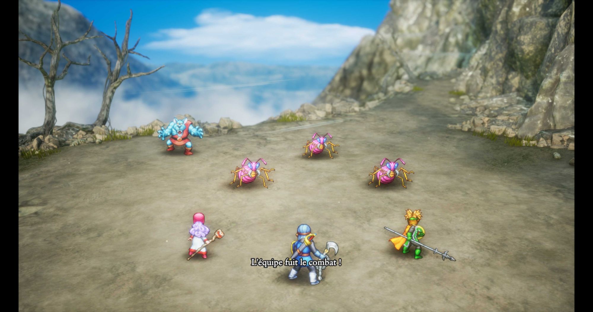 Pour le reste, c'est du classique : vous écumez vertes plaines, jolies montagnes et tendres forêts en fracassant des crânes à tour de bras. Mais vraiment. Vous ne pouvez pas faire vingt pas sans qu'un combat aléatoire s'enclenche, au tour par tour. Il faut quand même respecter les fourmis et autres crabes qui vous attaquent, tout ça pour se faire one shot par votre boomerang. Idiots mais courageux. Dommage que ces combats soient incessants, couplés à de pénibles allers-retours au tout début de Dragon Quest II (ah ! la piste du Prince de Cannock !). La téléportation finit par bien aider quand elle devient enfin disponible. Mais vous allez regretter le système de Bravely Default II où les monstres faibles fuient votre groupe. Bon. Au moins cela facilite le grind en début de partie.
