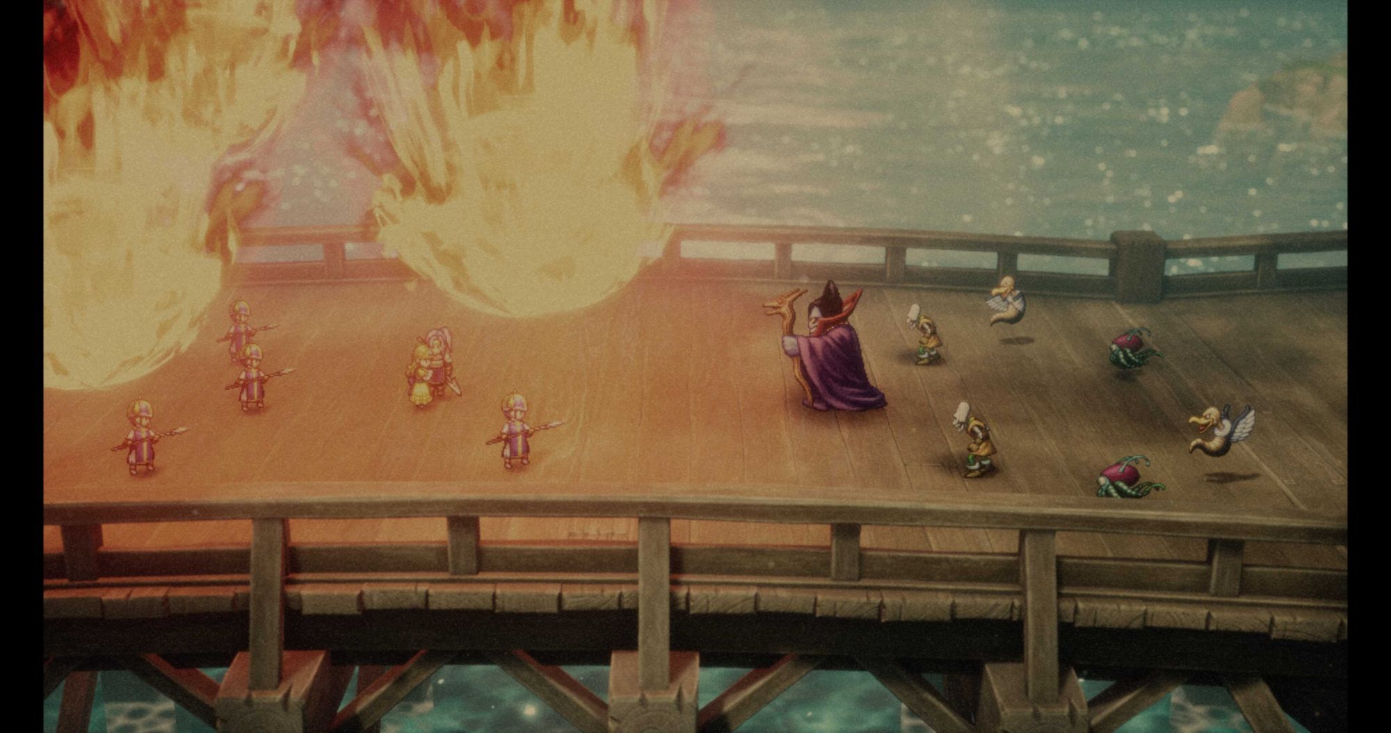 Et Dragon Quest II alors ? Rebelote. La paix est revenue dans les verts pâturages d'Alefgard. Mais brièvement bla-bla-bla... Invasion démoniaque... Embrochage de roi... Descendance d'Elric... Bref, c'est encore bibi qui s'y colle. Si vous avez déjà joué à Dragon Quest III HD-2D Remake, vous ne serez pas dépaysé. L'histoire est toujours un peu la même, les rebondissements aussi (Clef du Voleur, téléportation, bateau, etc.). Et la réalisation est identique, avec les mêmes assets graphiques.