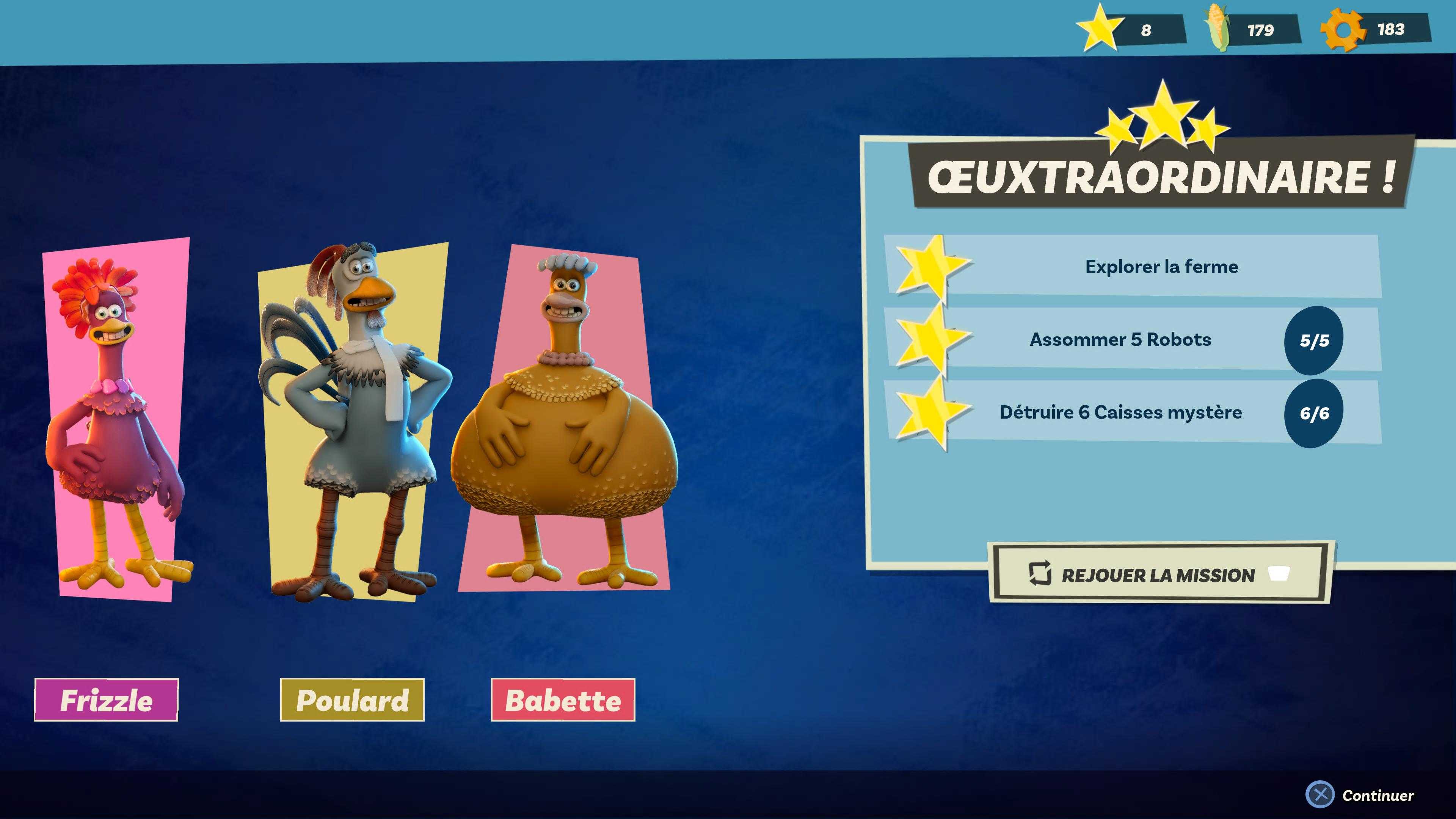 D'ailleurs, les dernières missions exigent d'avoir débloqué tous les poulets héroïques. Vous pensez d'abord pouvoir vous reposer sur vos deux ou trois préférés, mais non : chacun finit indispensable. Une bonne manière d'obliger le joueur à exploiter toute la richesse du gameplay... et de rire encore davantage devant les aptitudes farfelues de certains.