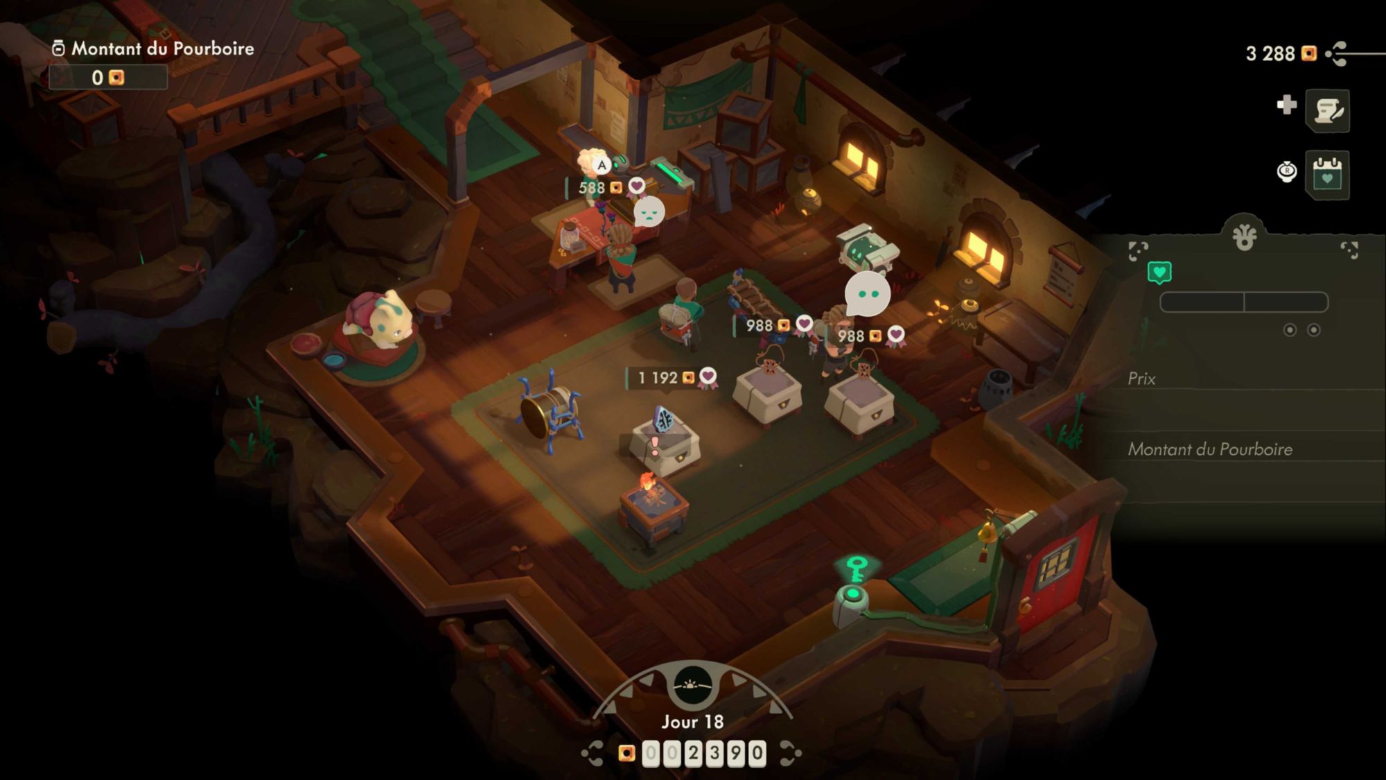 Vous commencez par entreposer votre loot sur de petits présentoirs, avant de définir un prix. Vous ouvrez la boutique, et des acheteurs viennent chiner. S'ils sont contents, ils ont fait une bonne affaire – vous, beaucoup moins. Il fallait vendre plus cher. Mais si vous êtes trop gourmand, les acheteurs quittent la boutique sans rien prendre. Un livre de compte se remplit heureusement après chaque transaction pour vous donner le prix idéal, au cas où vous looteriez le même objet plus tard. C'est tout simple mais incroyablement addictif. Surtout que vous vous attachez à ces objets durement acquis, puis renforcés au prix de quelques sacrifices.