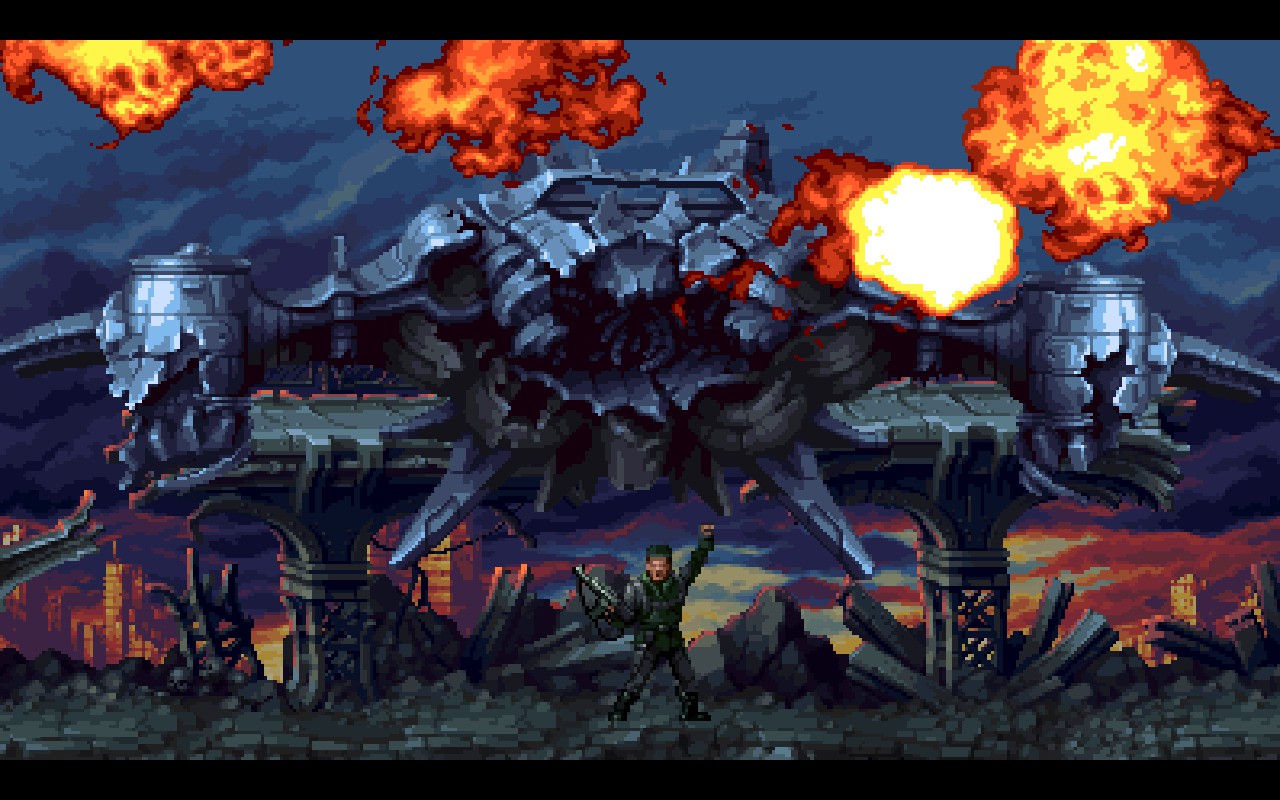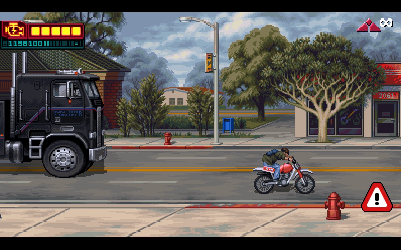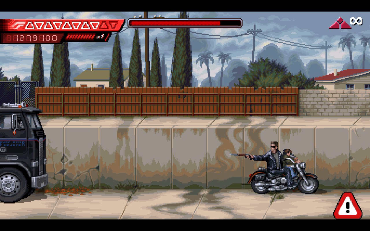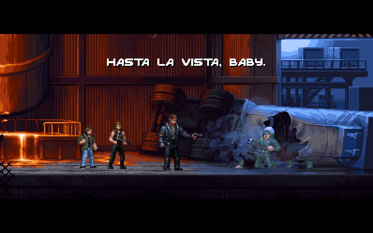 Tout dans Terminator 2D vous plonge dans le début des années 1990. Le titre est un hommage puissant à la série des Terminator sortis sur Super NES, Mega-CD, MS-DOS... Les décors sont sublimes, les animations aux petits oignons : ça sent bon le rétro maîtrisé. Même les transitions entre les chapitres, avec l'écran se fermant sur un "Terminator 2" métallique, le bruit avec, sont pensées pour vous mettre dans l'ambiance. Côté sonore, vous n'êtes pas en reste : les armes, les musiques, les explosions, les moteurs vrombissants... rien n'est laissé au hasard !
