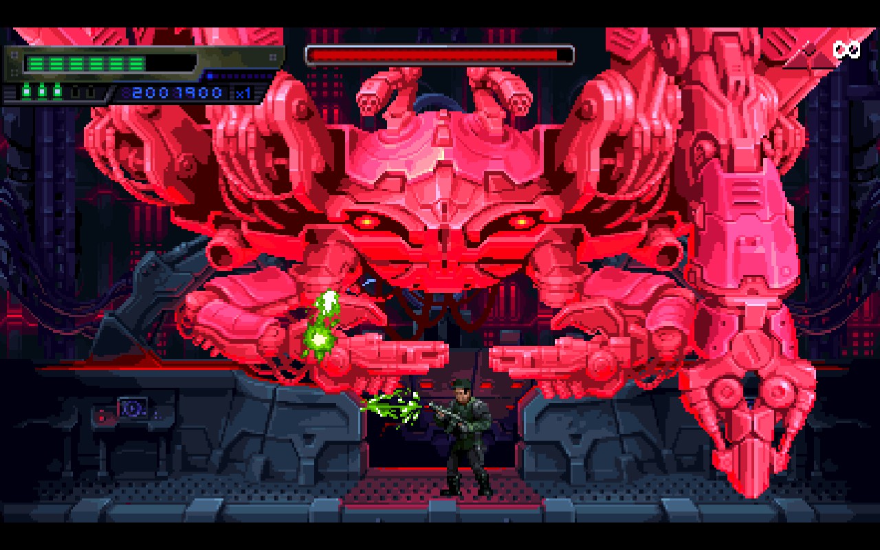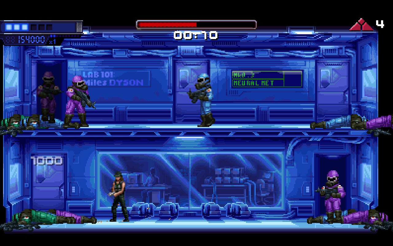 Terminator 2D se termine d'une traite en facile mais demandera plusieurs tentatives pour venir à bout de l'histoire en mode normal, en sachant que deux autres modes de difficulté existent. Si vous vous attendez à un jeu tactique, détrompez-vous : le titre récompense les joueurs qui se jettent au feu. Foncez dans le tas avant que les ennemis n'aient le temps d'ouvrir le feu : dans Terminator 2D, la meilleure défense, c'est l'attaque. À juste titre, vous pouvez vous attendre à quelques redondances : les niveaux ne sont pas très longs, les ennemis pas si variés, et les maigres secrets ne le resteront pas longtemps au fil de vos runs. Mais rappelez-vous : le jeu s'inspire grandement des titres de l'époque et cette frugalité fait partie du lore du titre.